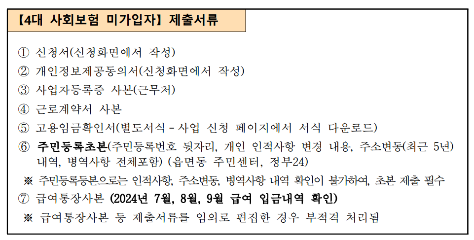 4대 사회보험 가입자와 미가입자의 제출 서류가 다르니 확인하시기 바랍니다.