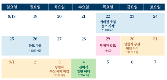 잔여석 : 당첨자 우선예매기간 종료 후 잔여석 한해 일반예매(선착순)으로 전환(1인 2매 O)