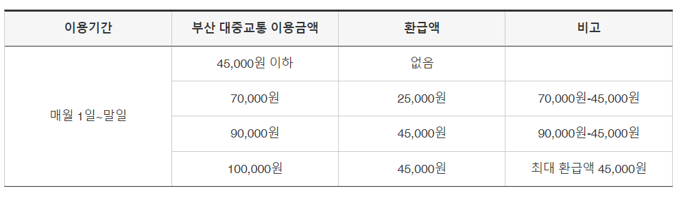 부산 대중교통 이용시 최대 4.5만원까지 사용월의 다음달에 환급해주는 서비스입니다.