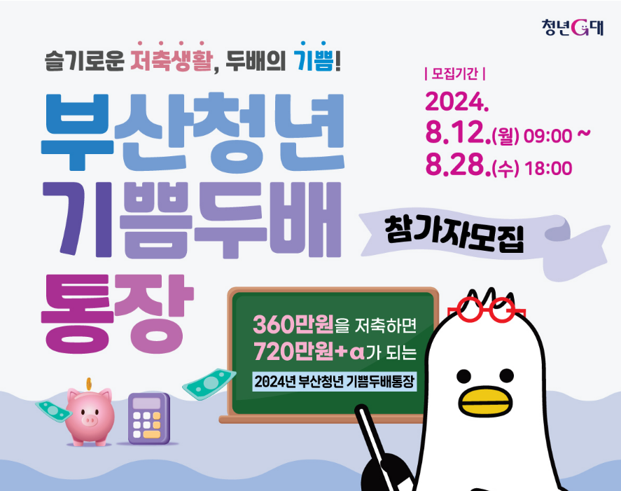 부산시에서 청년들의 경제적 자립을 마련하고 안정적인 미래 설계를 지원하기 위해 부산 청년 기쁨 두 배통장 사업을 추진하고 있습니다. 내가 저축한 금액이 2배로 불어나며 만기 수령 시 이자까지 붙으니 신청을 안하면 오히려 손해입니다!