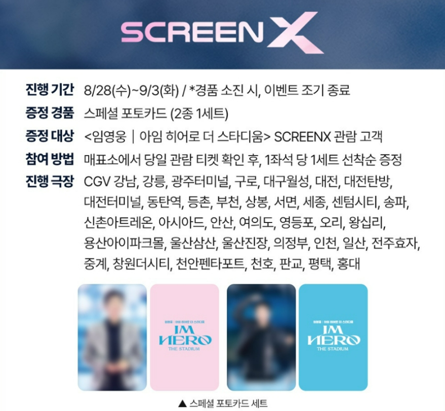✅ SCREEN X 관람 시 임영웅 콘서트 포토 카드 2종 1세트 증정