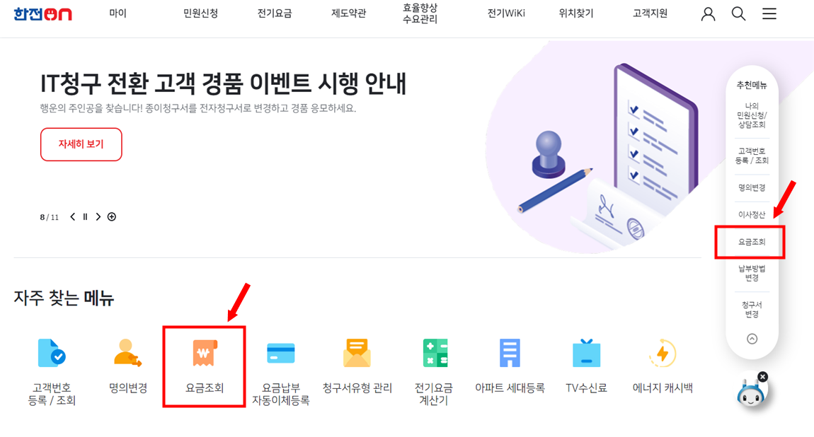 ✅ 요금조회는 아래 캡처 화면 화살표에 있는 '요금조회'를 클릭하시면 됩니다.