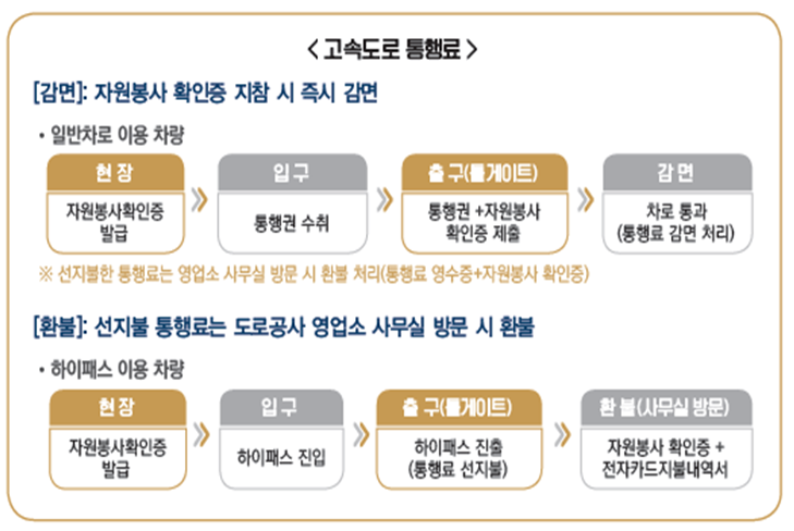 - 통행료 선지불 > 해당 고속도로 영업소 사무실 방문 > 환불처리(통행료 영수증 + 자원봉사확인증 반드시 지참)