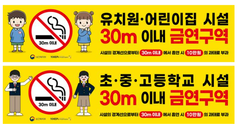 금연구역 확대에 따라, 각 지방자치단체에서는 어린이집, 유치원, 초, 중, 고등학교 시설 경계 30 이내에 금연구역임을 알리는 표지를 건물 담장이나 보도 등에 설치 및 부착해야한다고 합니다.