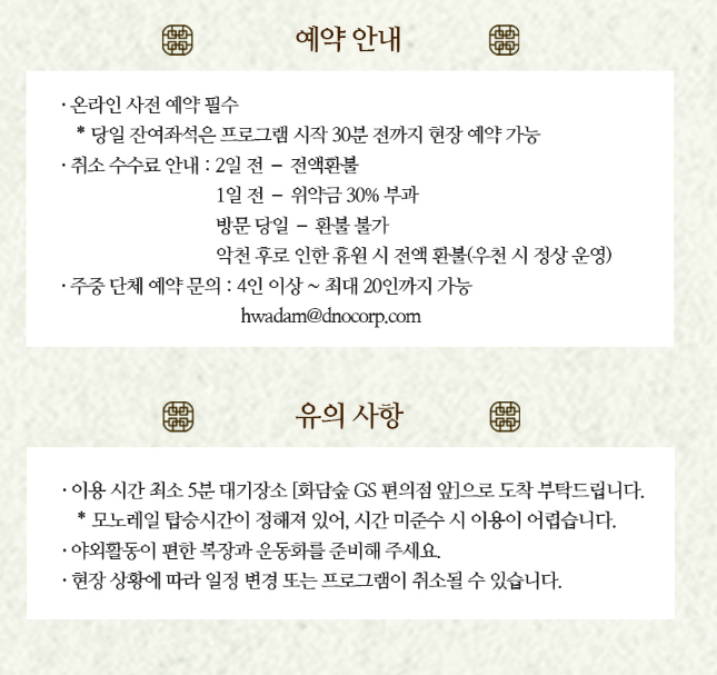 - 이용 당일 화담숲/ 화담채 입구 및 모노레일 탑승장에서 QR코드 제시 후 입장