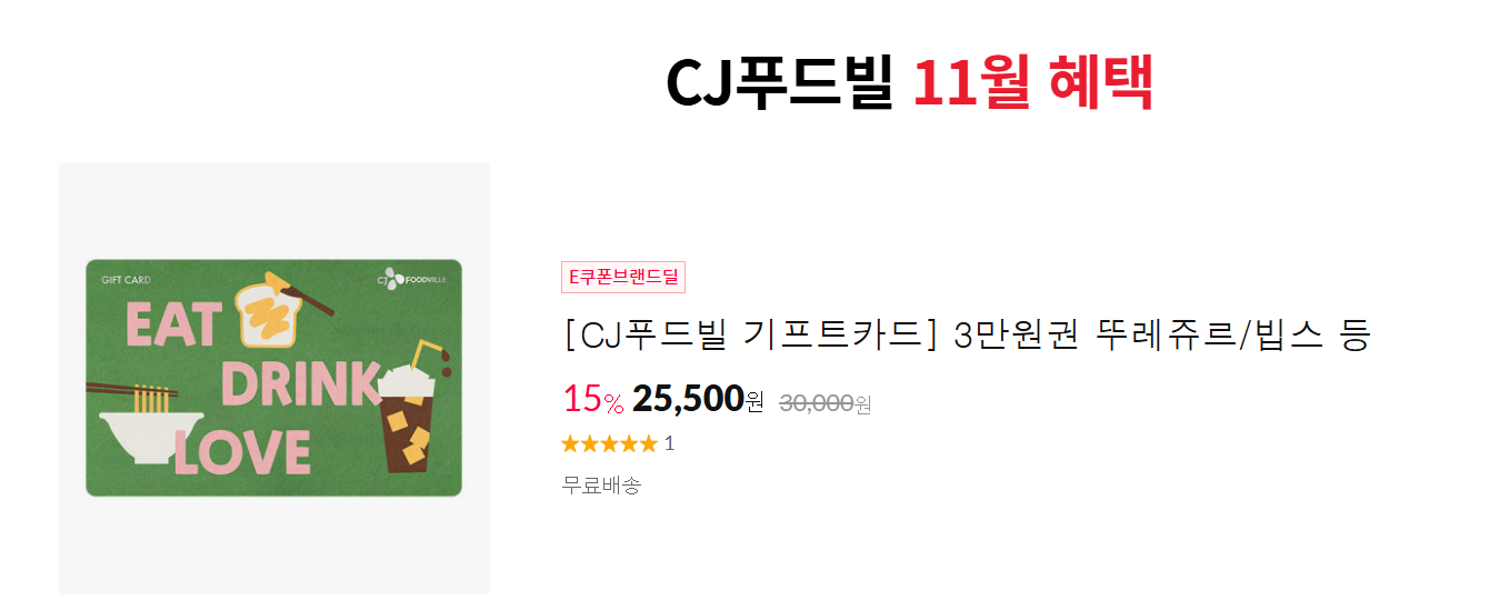 1년에 단 한번 진행되는 이번 11번가 그랜드 십일절 행사 기간 동안 CJ 푸드빌(뚜레쥬르, 빕스 등) 기프티 카드를 15% 할인된 가격으로 구매할 수 있으니 이 기회를 놓치지 않으시기 바랍니다.