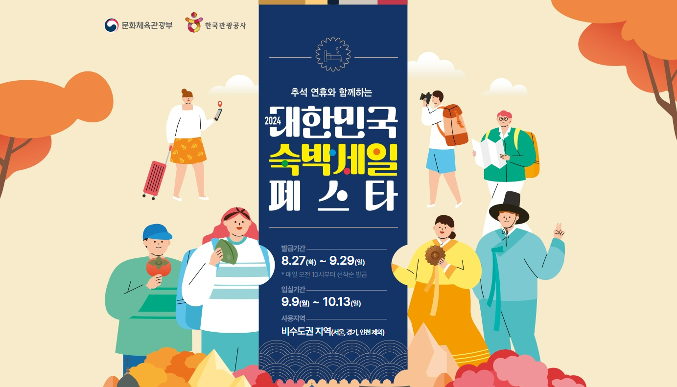 다가오는 추석 명절에는 2024 대한민국 숙박세일 페스타 쿠폰을 활용하여 할인된 가격으로 여행지의 숙박시설을 이용해 보시기 바랍니다. 2004년 출생 이후자는 누구나 참여가 가능합니다.