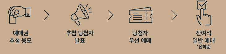 예약기간 내 예매권에 대해 추첨 응모 후 당첨자가 우선 예매하는 방식으로 잔여석이 남으면 선착순 일반예매로 다시 진행됩니다.