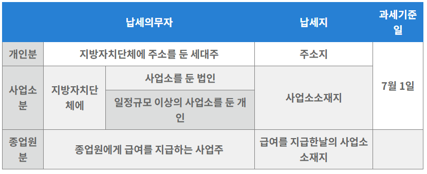 - 7월 1일(과세기준일) 현재 해당 지방자치단체에 사업소를 둔 개인사업자 및 법인